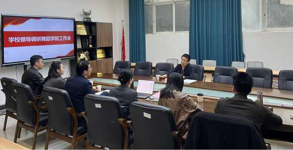 首先在513学术研讨中心举行座谈会。学院院长张恩思进行工作汇报,他从学科发展定位、现状分析和发展规划三个方面进行阐述。他指出,在学科发展定位与思路上,明确“特色化引领、高质量发展”定位,形成“教研创演”四位一体育人闭环,构建新时代“三类人才”培养新范式。针对现状分析与提升路径,客观剖析学院在师资队伍、科研创作、人才培养等方面的优势与不足,提出通过作品创演、课程创新、传播创融等模式精准破局。关于未来5年发展规划,从党建引领育人、教学质量突破、舞蹈教育专业申报等维度进行系统谋划,为学院发展锚定长远目标。