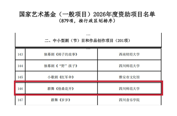 《国家艺术基金(一般项目)2026年度资助项目名单》于2025年12月2日至8日进行了公示。四川省共有37个项目获得资助,其中我院陈倩副教授申报的原创舞蹈作品《格桑花开》成功立项“中小型剧(节)目和作品创作”项目。