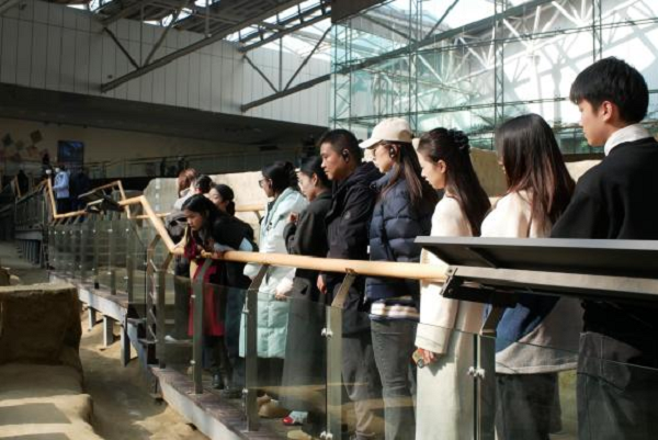 到达博物馆后,在讲解员的引导下,师生们依次参观了遗迹馆与陈列馆。从象征古蜀智慧的太阳神鸟金箔,到庄重神秘的青铜神树;从雕琢精美的玉璋玉璧,到厚重沧桑的象牙遗存——每一件文物都仿佛在静静诉说着千年文明的故事。大家驻足凝视,细致观摩,在近距离地接触中感受历史的脉络与文物所承载的文化精神。