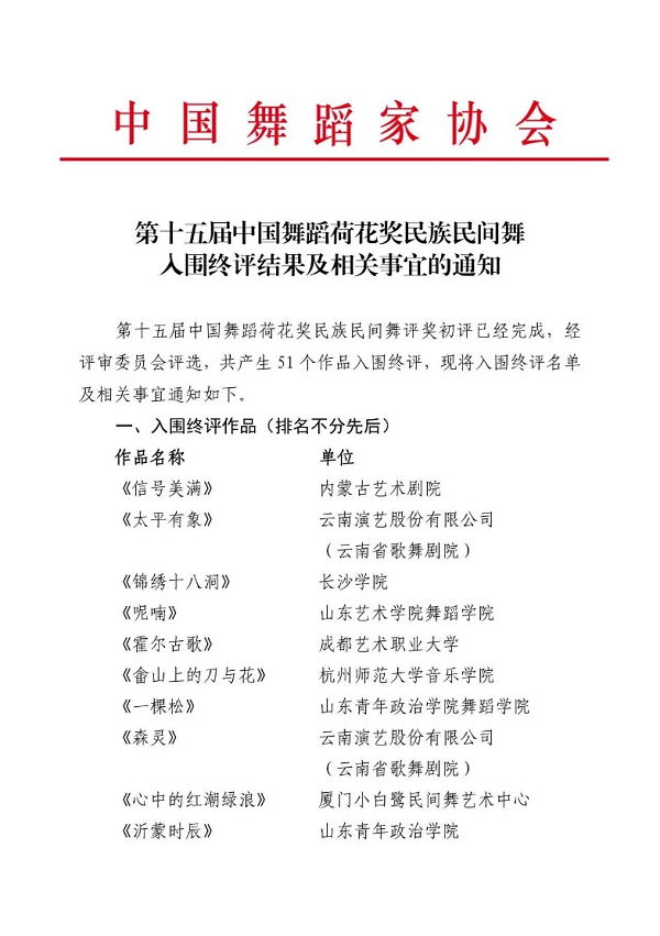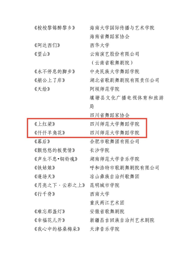 9月19日,第十五届中国舞蹈“荷花奖”民族民间舞入围终评结果正式公布,舞蹈学院原创作品《上红梁》《仟仟羊角花》《格桑花开了》携手入围终评。